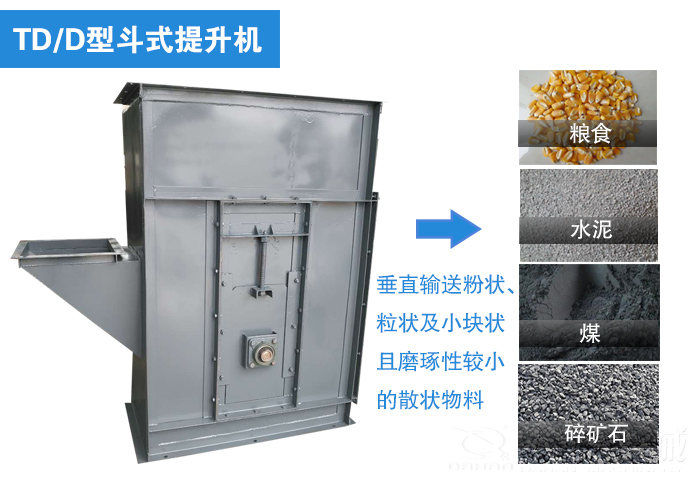 TD型斗式提升機是按照JB3926-85《垂直斗式提升機》標準設計生產的,該種類斗式提升機使用功率比較低,輸送物料范圍廣。與傳統D型斗式提升機相比,該種類的斗式提升機輸送效率高、料斗形式多。它主要是由運行部分(料斗與牽引膠帶)、帶有傳動滾筒的上部區段,帶有拉緊滾筒的下部區段,中間機殼,驅動裝置,逆止制動裝置等組成,大輸送量5.4-2m3/h,提升高度大40m。