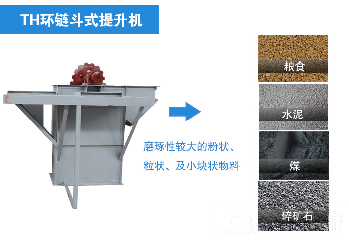 TH系列斗式提升機是一種常用的提升設備,其主要由由運動部分(料斗與牽引鏈條)、帶有傳動鏈輪的上部區段、帶有拉緊輪的下部區段、中間機殼、驅動裝置、逆止制動裝置等組成,該種類的斗式提升機采用混合式或重力卸料,挖取式裝料。TH型區別于TD型皮帶斗式提升機,其提升量更大、運轉效率更高,大輸送量5.4-2m3/h,大提升高度為50m。