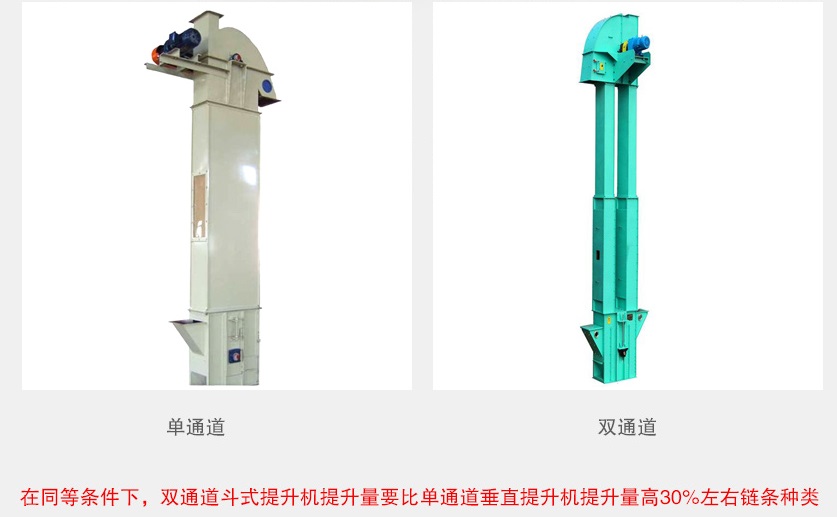環鏈斗式提升機分為單通道和雙通道兩種,雙通道主要是加強整機的中間節強度,提升量會高出30%左右,一般的單通道斗式提升機是料斗的上行和下行都是在一個機殼通道內,價格會比雙通道斗式提升機更便宜。