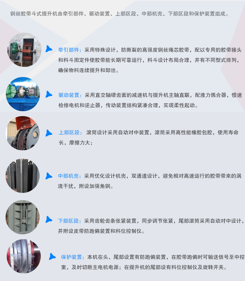 1、運行部件:采用特殊設計,帶防撕裂的高強度鋼絲繩芯膠帶,配以專用的膠帶接頭和料斗固定件使膠帶能長期可靠運行,料斗設計布局合理,并有不同型式排列,確保物料連續提升和卸出。