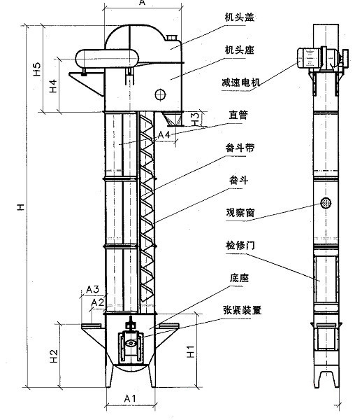 斗式提升機由上部區段、中部機殼、下部區段、帶料斗的輸送帶等牽引部件、傳動裝置和室外檢修平臺組成。